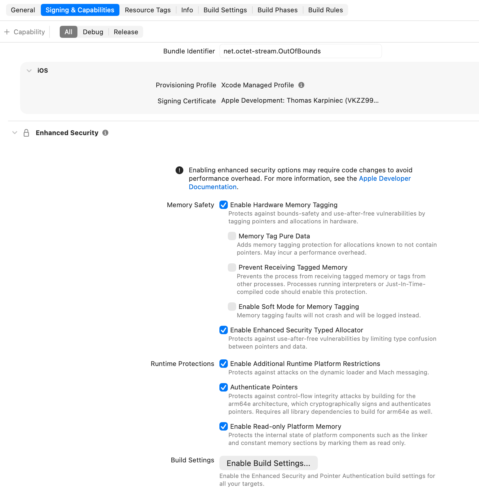 No need to imagine: Apple has already shipped it. It's called Memory Integrity Enforcement. If you have one of their latest processors, the A19 or M5, this capability is already in your hands. Third party developers can opt in to have the same protection applied to their own apps. Below, I'm going to show how this looks in Xcode.