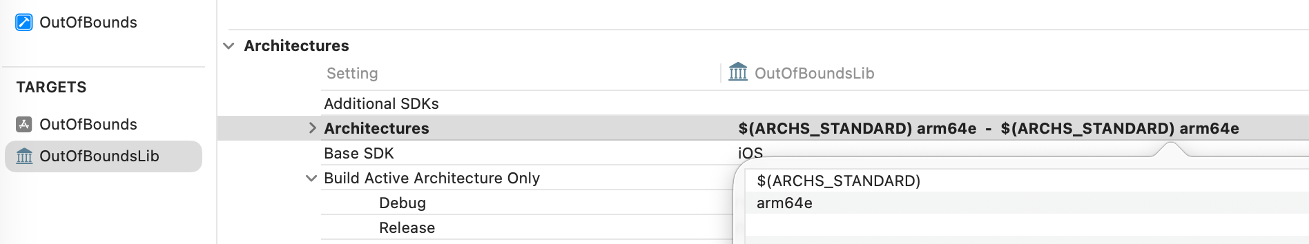 I decided I would add a Static Library target containing some buggy Objective-C code to see if MIE would pick it up. To make this build as part of my app I had to add arm64e to Architectures. It seems that having separate build artefacts is how you can support both MTE and non-MTE devices.