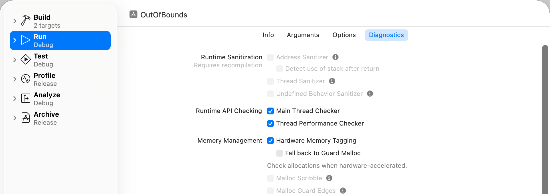Less obviously, Hardware Memory Tagging is not actually enabled by default in the Run scheme. Edit the scheme, and in the Diagnostics tab toggle on Hardware Memory Tagging.