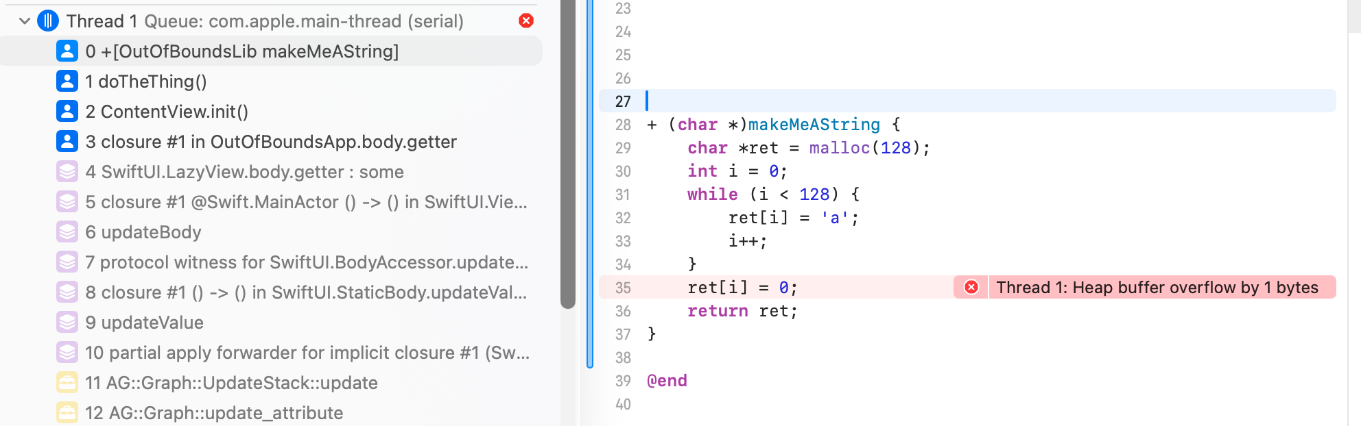 Would you look at that runtime error? Isn't it beautiful? "Heap buffer overflow by 1 bytes"