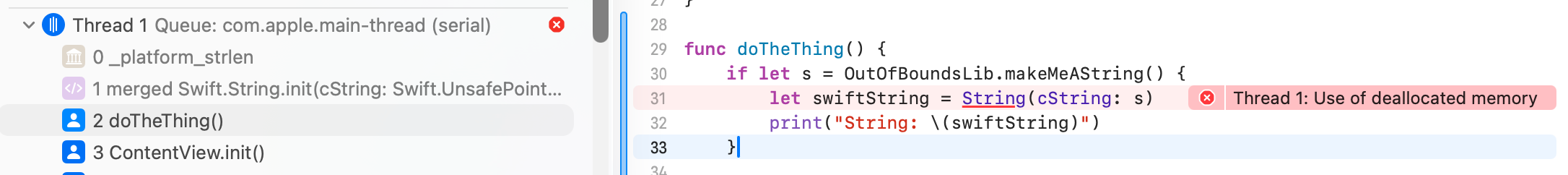 "Use of deallocated memory". It's not going to get much clearer than that. This time we're seeing the error in Swift because that's where the freed pointer is actually dereferenced.