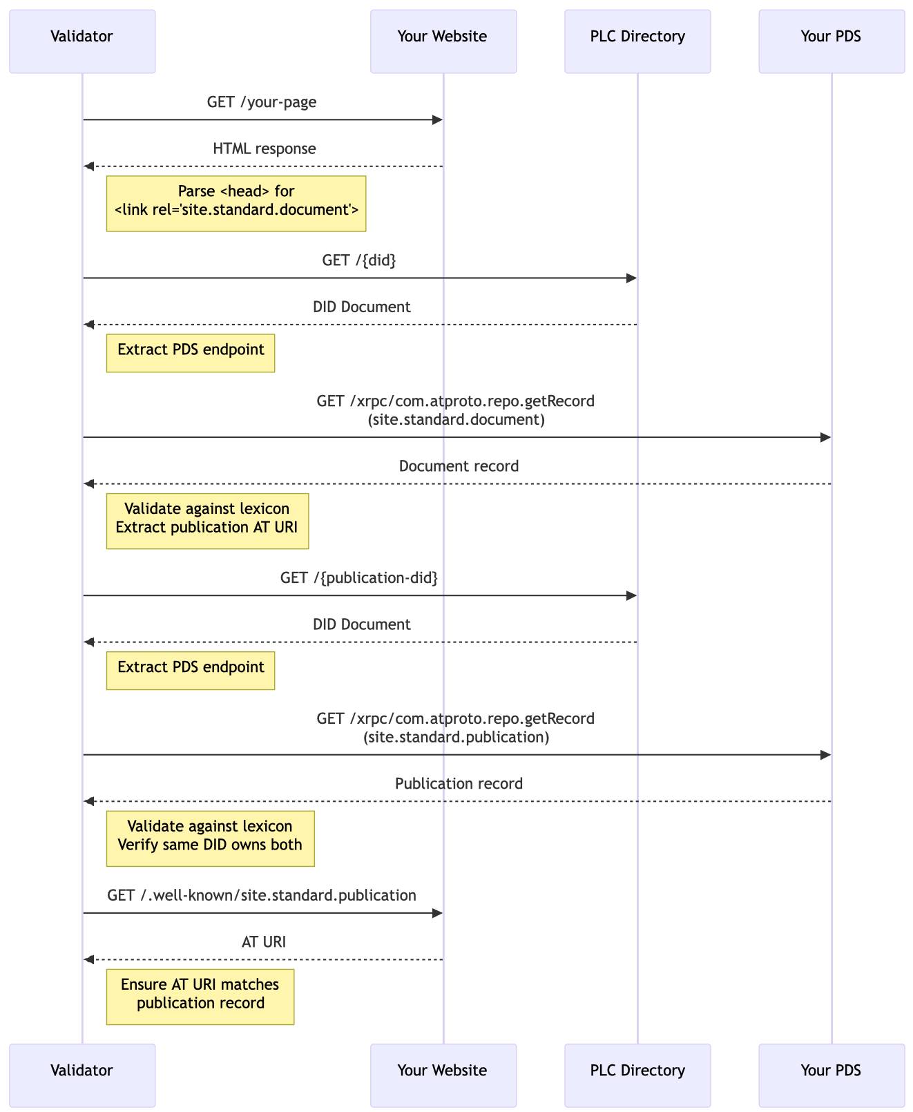 Now, there is another perspective to validation that's very important. Imagine you're writing an appview that's scouring the firehose for standard.site records and you want to know which ones you can trust. This problem is backwards from how my validator works—you're starting from the record from the PDS, then checking the URL. I know that Filippo Valsorda is working on this for his appview—if you are aware of any other implementations please let me know!