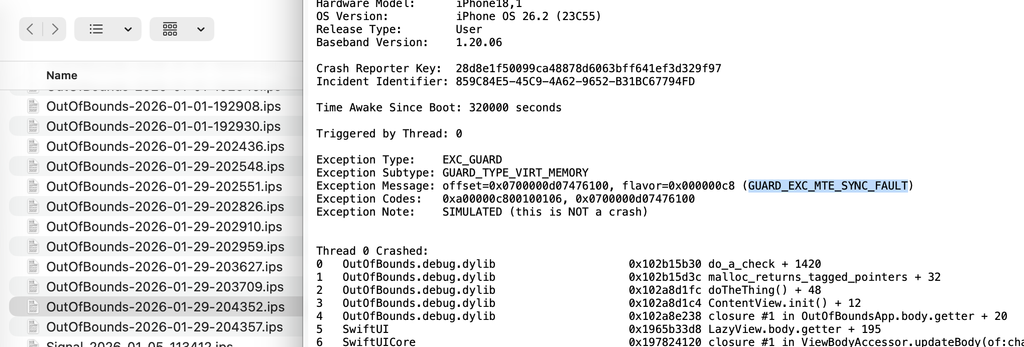 Even this new information doesn't fully explain what I saw a couple of weeks ago, however. When I was launching the app outside the debugger I had tonnes of crash reports accumulating on my phone but I didn't see any MTE ones. This was partly my oversight: once I had followed Eskimo's instructions to produce a valid simulated crash and knew exactly what it looked like, I trawled through carefully one at a time and found that I had previously triggered soft mode in two cases, in amongst a deluge of regular memory corruption crashes where it seemed MTE wasn't active at all. I'm not surprised I was confused. When I went back to my original app yesterday, and soft mode worked, I hadn't changed a single thing. My macOS, iOS and Xcode are still on the same versions.